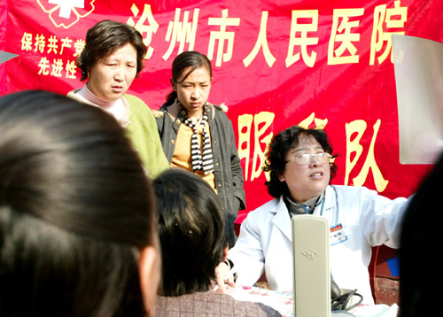 73岁的刘丙乐老人第一个坐在大夫桌前,他说近期突然发觉搬东西不得劲,腰疼。市人民医院骨科大夫为他作了检查,原来他患有轻微的腰间盘突出。大夫为他提出治疗建议后,老人满意而去。郝玉英老人,从去年就觉得四肢无力,气喘。内科大夫检查出她的心脏较大,建议她去大医院查查。郝大妈乐呵呵地感谢大夫:“知道自己的毛病就好了,等下礼拜孩子们回来,俺就去。”当地的村民,赶集的外乡人,争先恐后拥向义诊处。一个刚离开,一个又坐下,他们有的要医疗保健材料,有的检查身体,短短一上午,就有三百多名村民接受了检查和咨询。