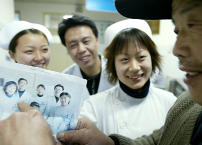 老人即将康复出院,拿着照片高兴地向人们逐个介绍为他治病的大夫。