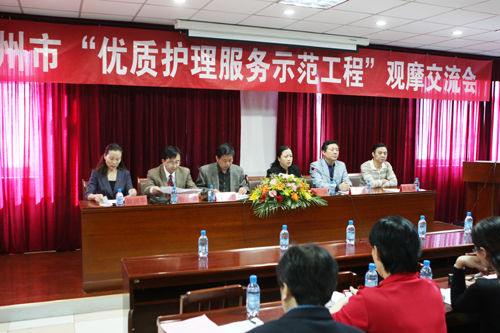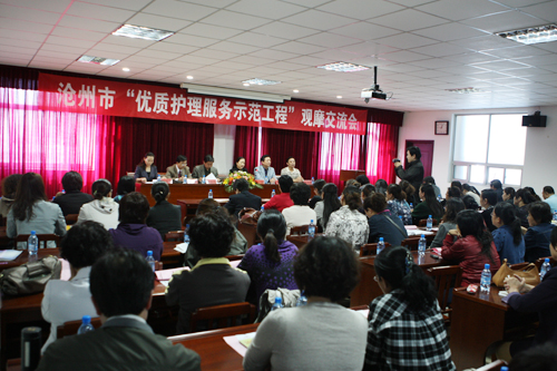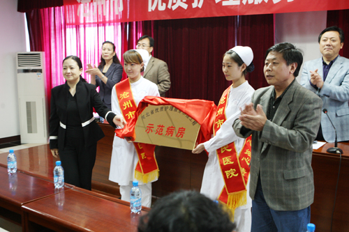 首先,沧州市人民医院王兆发院长进行了激情洋溢的致辞,省卫生厅刘丽副处长、市卫生局的赵振江副局长为沧州市人民医院“优质护理服务示范工程”试点病房进行揭牌;接下来,刘丽副处长深入分析了当前护理工作面临的形势和存在的主要问题,进一步强调了“护理工作要服务医改全局”的思想,要求大家进一步认识新时期、新形势下护理工作的重要作用和深刻内涵,认真贯彻落实卫生部、省卫生厅关于加强护理工作的文件精神,以开展“优质护理服务示范工程”活动为契机,积极推动护理服务的改革和护理事业的发展,努力通过为患者和社会提供满意的护理服务提升护理工作的价值。赵振江副局长总结了“优质护理服务示范工程”开展以来在我市取得的成效,尤其对沧州市人民医院取得的成绩予以了充分肯定,同时对下步工作的开展提出了新的要求和希望。随后,沧州市人民医院介绍了她们如何开展“优质护理服务示范工程”工作的做法和经验,并对试点病房进行了参观。
