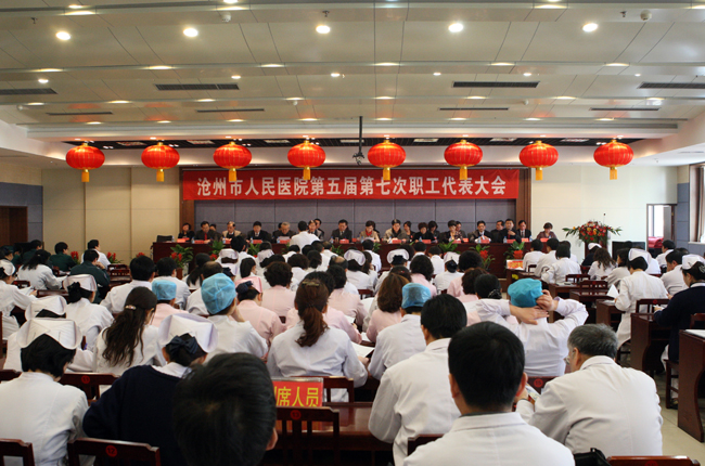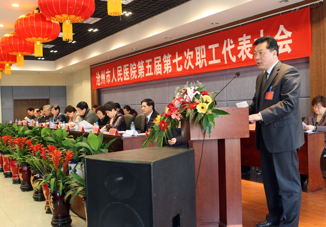 大会首先由市总工会科教文卫体工会于新荣主席讲话。她说,很高兴参加沧州市人民医院第五届七次职工代表大会。这次大会的召开是全院干部职工政治生活中的一件大事,是各位代表进言献策,共商发展的大会。在此,我代表沧州市总工会向大会的胜利召开表示热烈的祝贺;向出席大会的全体代表并通过你们向全院职工致以崇高的敬意和亲切的问候!