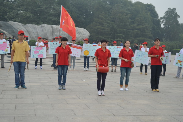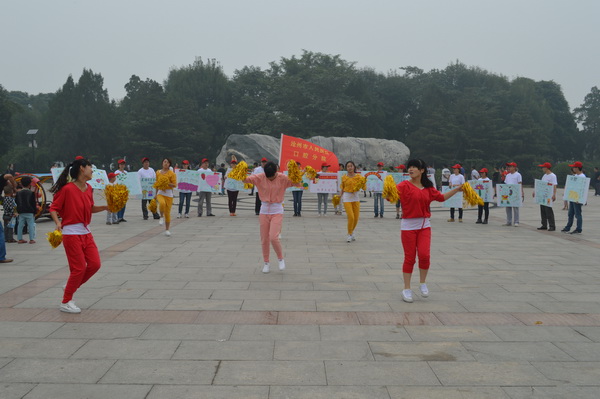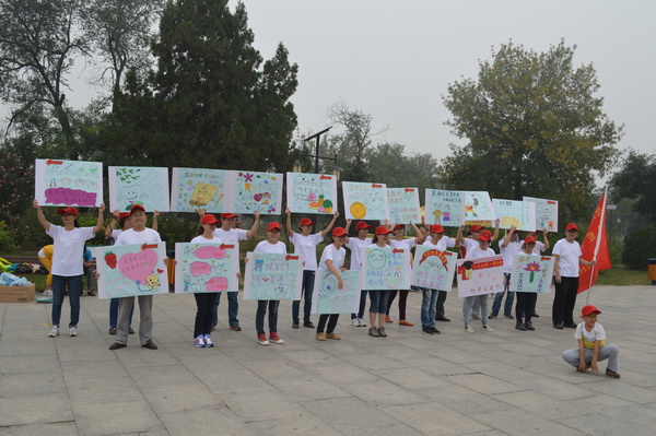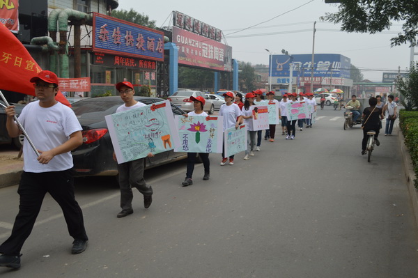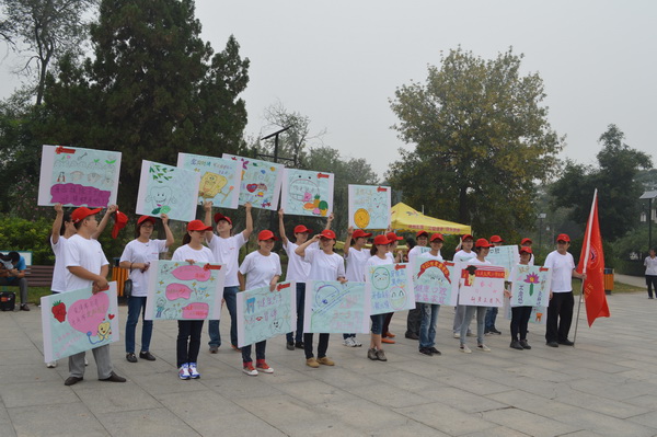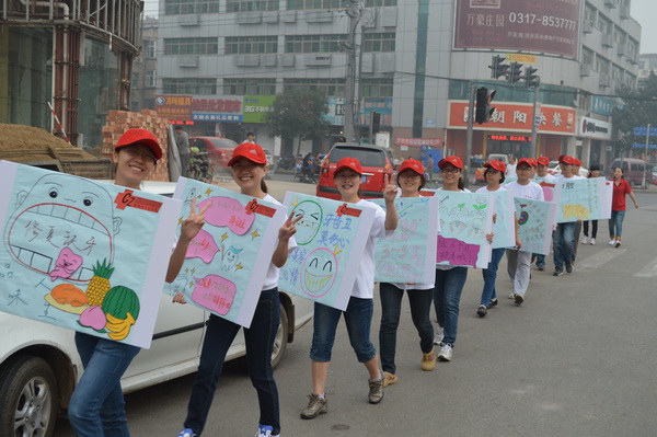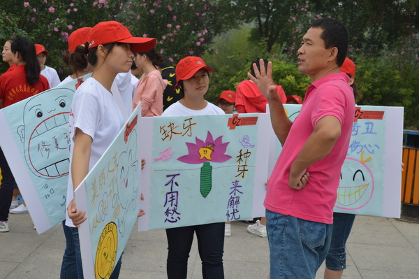 白色的T恤,红色的帽子,手举用当前流行的淘宝体、咆哮体、卡通图案等制作的个性口腔保健宣传牌,9月20日,二十余名年轻“快闪族”穿梭于大街小巷,并现身于人民公园、华北三期广场、南湖公园,以自己独特的行动为来往的市民献上了一场生动有趣的口腔保健秀。