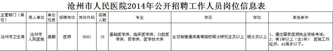 1、《沧州市人民医院2014年公开招聘工作人员岗位信息表》