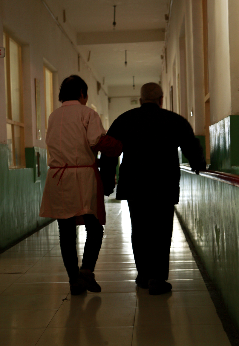 图三,由于白内障,老人的出行都是有护工来帮助。