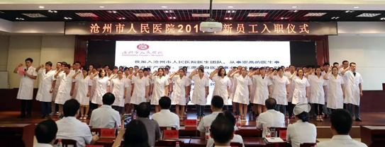 7月31日下午,2017年新员工入职仪式在我院本部学术报告厅隆重举行。通过公开招聘的方式,125名人员经由笔试、面试等考核程序,一路过关斩将来到沧州市人民医院这个大家庭。他们当中有研究生70名、本科生55名,均来自全国重点高等院校,包括临床医学、护理、药学、医技等专业的优秀人员。