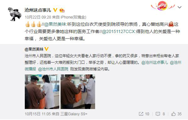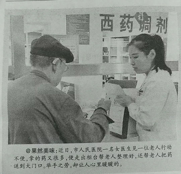 近日,网友@果然美味的一条微博在沧州新闻媒体及社会上引起了广泛关注,原来他在沧州市人民医院就诊时遇到了这样一幕:一位年轻女医生看到老人行动不便又拿了许多药品,便从药房出来帮老人整理好药品并送其到大门口。他说虽然这只是一个平常之举,却让人的心里暖暖的。