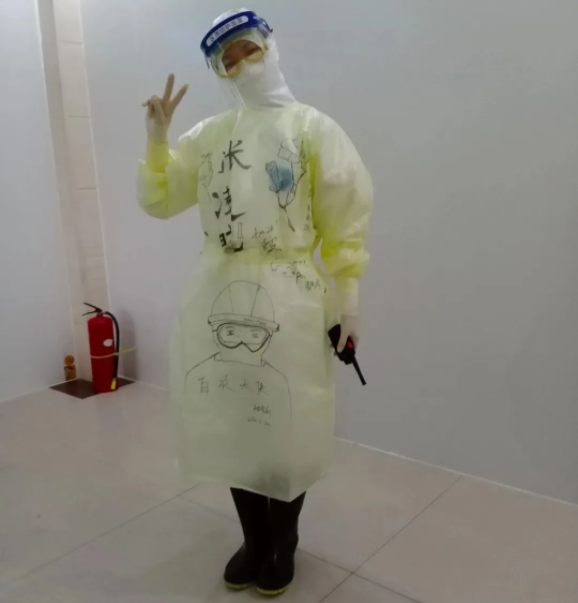 在做完本班工作后,张凌晓也常去病房和她们聊天。有个病人问她,“天天和我们在一起害怕吗?”,张凌晓摇着头将双手高高举起摆出“剪刀”胜利的姿势说;“我不怕,我有铁布衫!”,病人被她逗笑了,看着她隔离衣上画的凌霄花说:“凌晓就是隔离病房最美丽的凌霄花”。大家的笑声似透过窗棂射进的缕缕阳光温暖了整个病房,映射到了每个人的脸上。疫情无情人有情,面对残酷的病毒大家没有胆怯,而是心手相连,并肩作战;面对严峻的疫情,大家没有退缩,而是守望相助,共克难关。