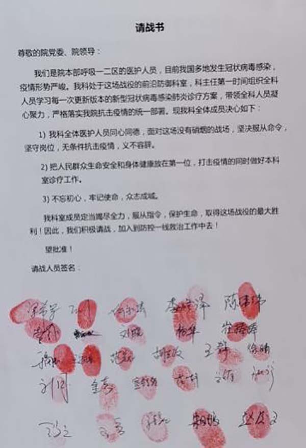 “人生贵有胸中竹,经得艰难考验时”。这是呼吸专业科室的请战书,科主任梁希军既是支部书记,又是学科带头人,他带领支部党员及科室全体医务人员,主动请战、毫不退却。