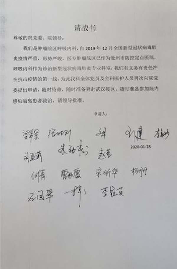 一份份请战书,诠释了医务工作者的忠诚与担当,刻画了医务工作者的无私与无畏。在这场疫情阻击战中,沧州市人民医院全体干部职工都做好了一级战备的准备。召必战,战必胜!