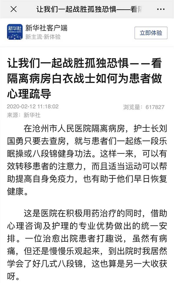 在沧州市人民医院隔离病房内,护士长刘国勇只要去查房,就与患者们一起练一段乐眠操或八段锦健身功法。这样一来,可以有效转移患者的注意力,而且适当运动可以帮助提高自身免疫力,也有助于他们早日恢复健康。这是医院在积极用药治疗的同时,借助心理咨询及护理的专业优势做出的统一安排。一位治愈出院患者打趣说,虽然有病痛,但还是慢慢乐观起来,到出院时我居然学会了好几式八段锦,这也算是另一大收获呀。