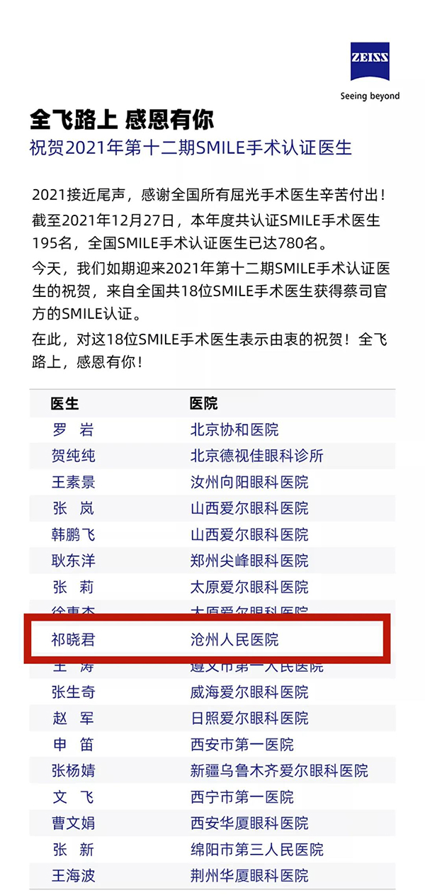 据悉,获得此项认证需要经过蔡司总部严格考核,从全飞秒手术医师的熟练程度,手术量、以及术后视力恢复情况进行综合考核。2021年第十二期全国共有18位SMILE手术医生获得蔡司官方认证。
