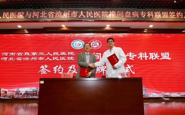 河南省直第三人民医院袁启东院长、沧州市人民医院党委副书记、副院长黄捷共同签约椎间盘病专科联盟协议