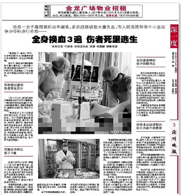 近日,《沧州晚报》整版报道了我院专家团队成功救治一名因车祸导致多处脏器破裂大量失血患者。
