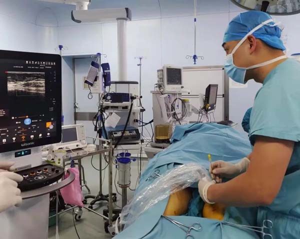 可郭大姐及家人考虑到手术风险、费用等问题,迟迟没有下定决心。就在郭大姐一家一筹莫展之际,听闻沧州市人民医院有治疗膝关节骨性关节炎的新技术,便来院就诊。经疼痛科杨洋主任团队病例讨论,决定为郭大姐施行双膝关节感觉神经热凝术。局部麻醉后,微创手术顺利完成,郭大姐疼痛明显缓解,术后即可下床活动。