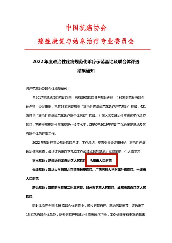 日前,中国抗癌协会癌症康复与姑息治疗专业委员会公布了2022年难治性疼痛规范化诊疗示范基地及联合体评选结果,沧州市人民医院经基地医院自评、工作总结、专家委员会评审讨论、难治性癌痛诊治情况核查,以第一名的成绩获评“难治性疼痛规范化诊疗示范”杰出基地。目前,全国仅有8家医院获此殊荣。