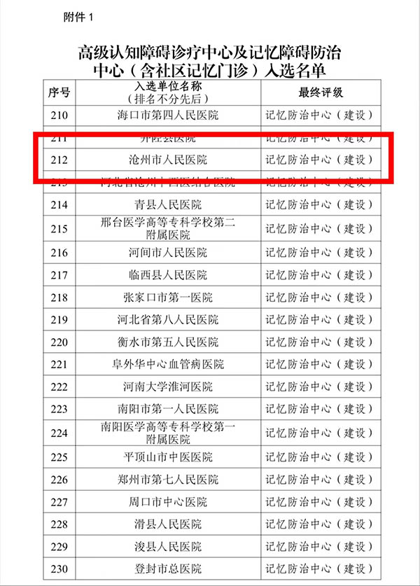 喜报!沧州市人民医院成功获批国家级记忆障碍防治中心(建设单位)