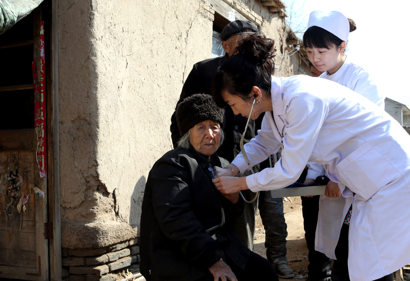 图8,大夫深入贫困村民家中,为行动不便的老人义务看病。