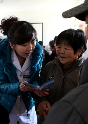 图4,“大妈,您的情况一定要注意了”,医生耐心的为村民讲解健康知识。