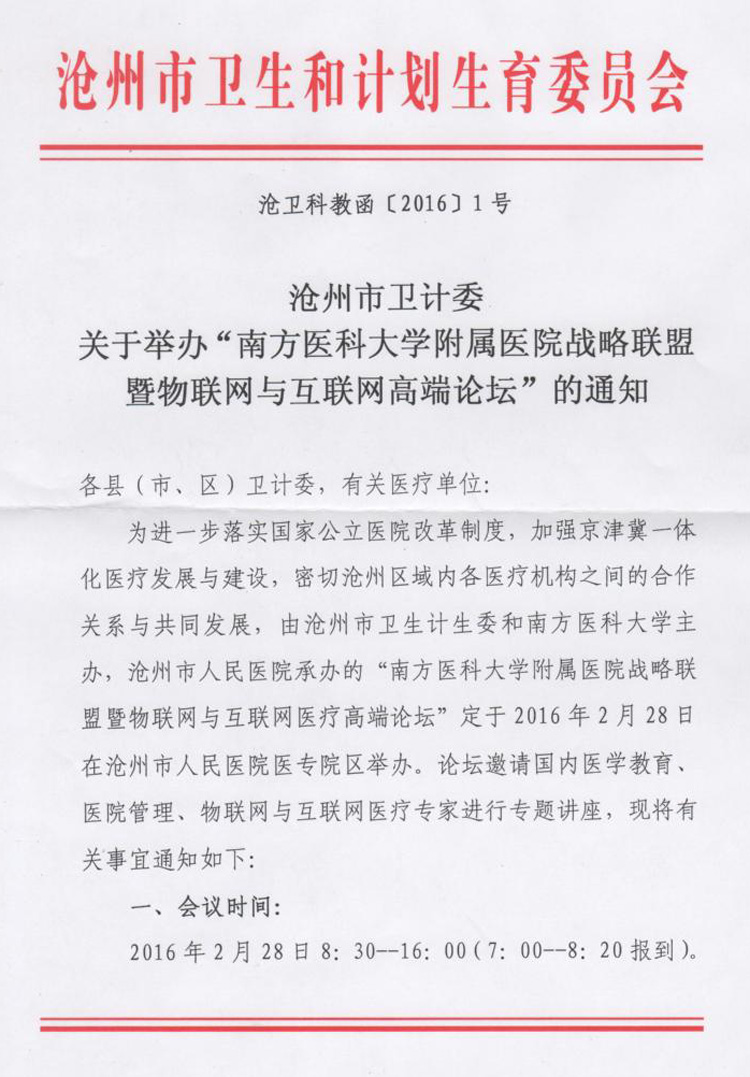 沧州市卫计委关于举办“南方医科大学附属医院战略联盟暨物联网与互联网高端论坛”的通知