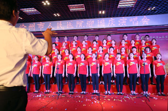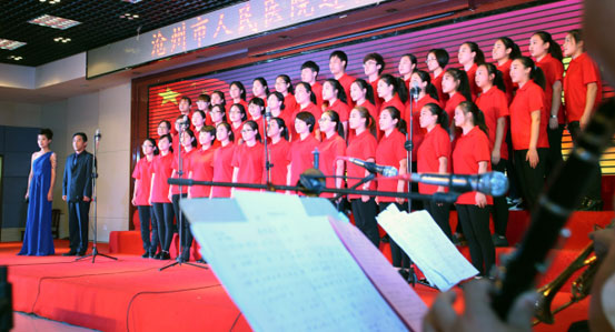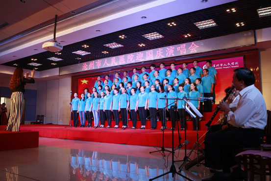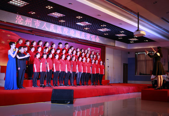 为庆祝伟大祖国67岁华诞,弘扬民族精神,29日,沧州市人民医院举办了以“唱响未来,医路前行”为主题的迎国庆合唱比赛,15支代表队整齐队列,精神饱满,齐唱红歌,表达自己对祖国母亲无限的热爱,向祖国送上一份诚挚的祝福。